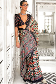 Hazel Green and Black Printed Ajrakh Satin Crepe Saree