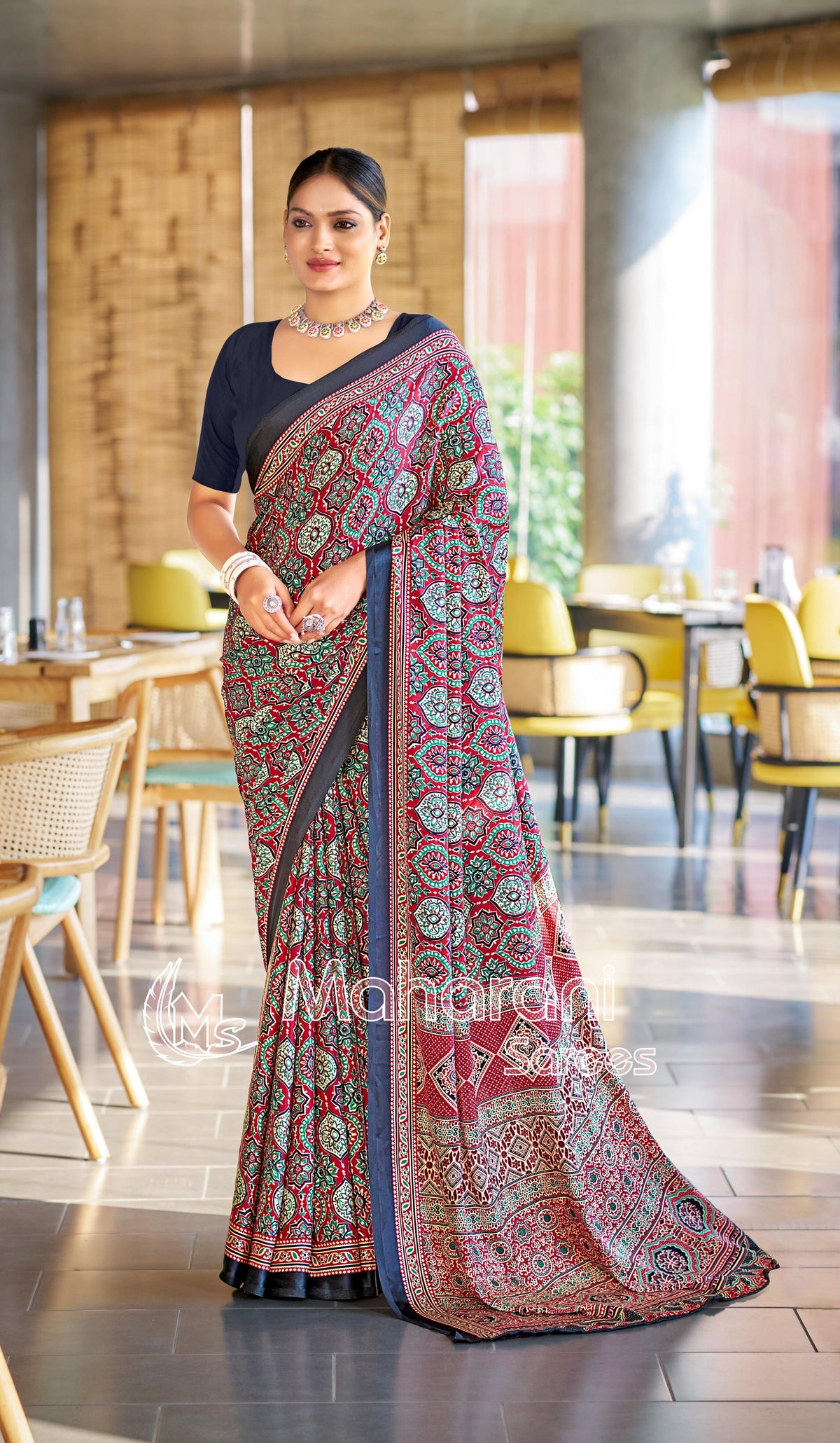 Luxurious Maroon Ajrakh Printed Soft Modal Silk Natural Print Saree P2 – Serene Wear index
