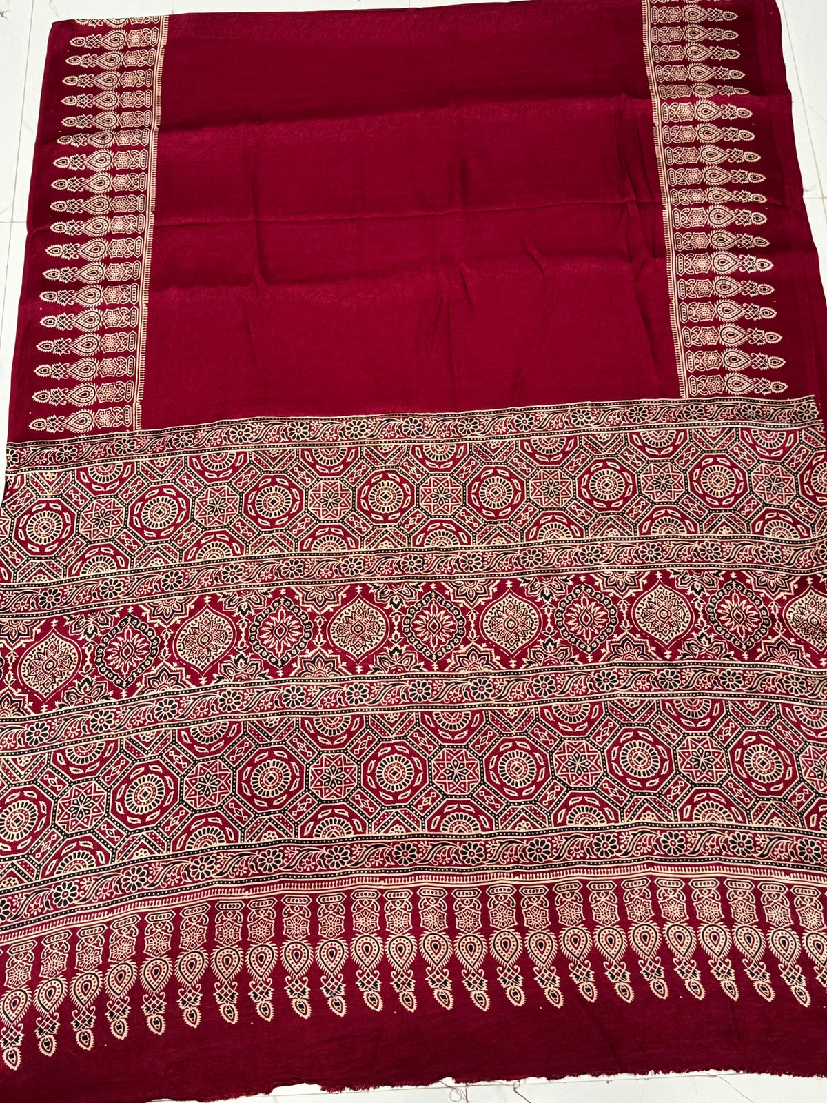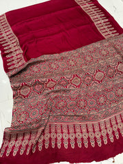 Maroon Ajrakh Hand Block Modal Silk Saree With Fancy Ajrakh Pallu and Border