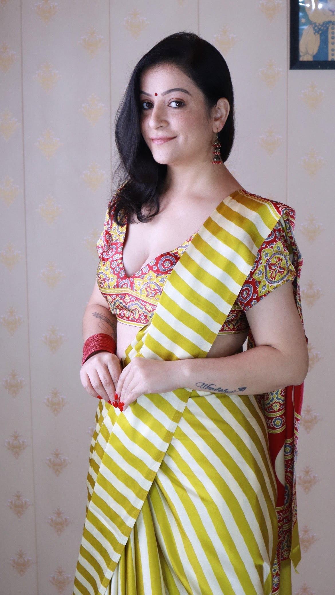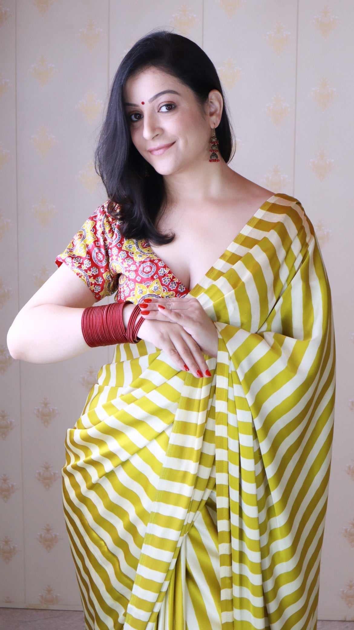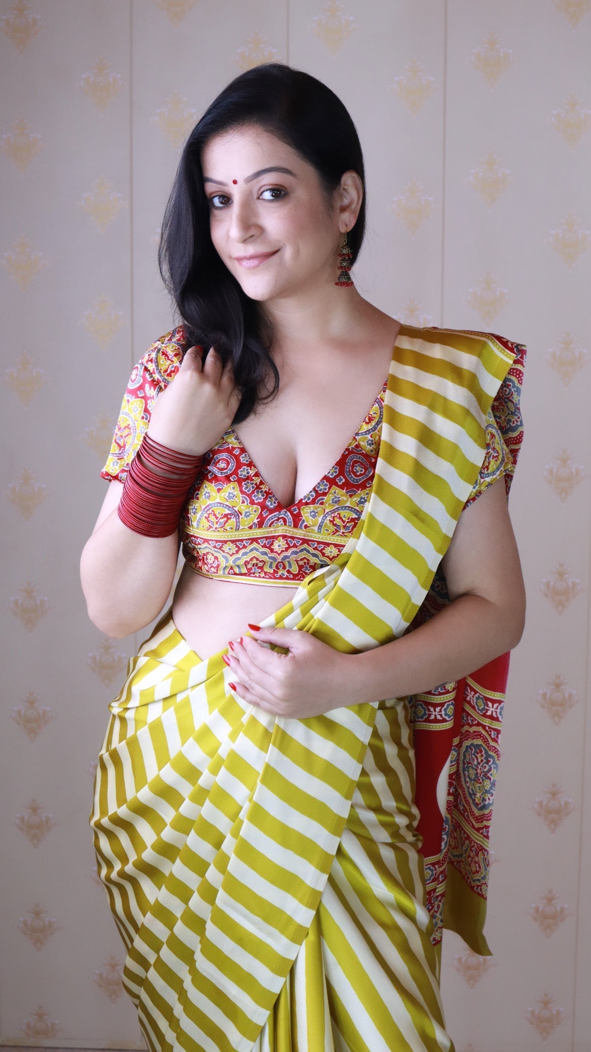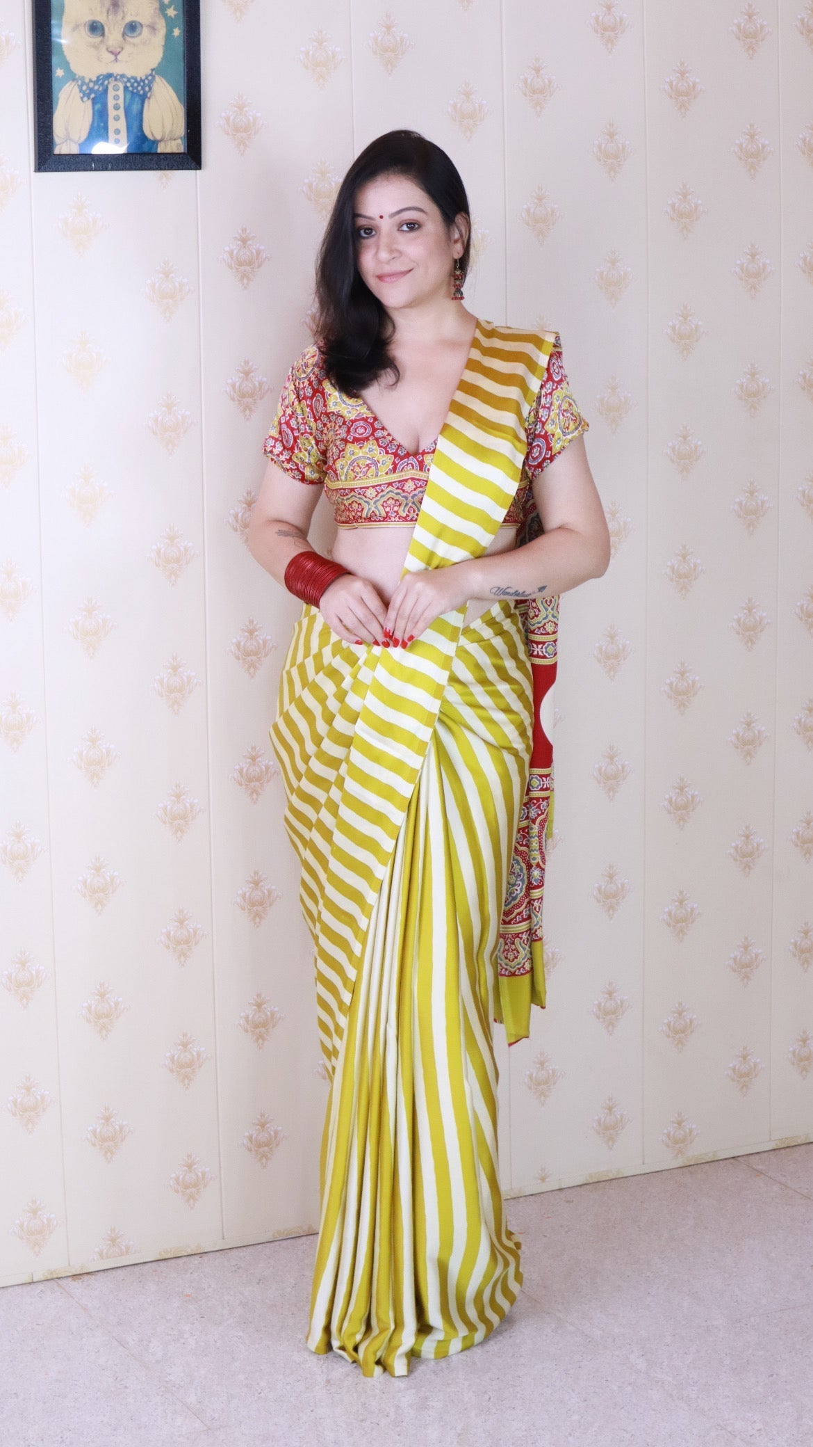Mustard Yellow Striped Ajrakh Hand-Printed Modal Silk Saree – Serene Wear index