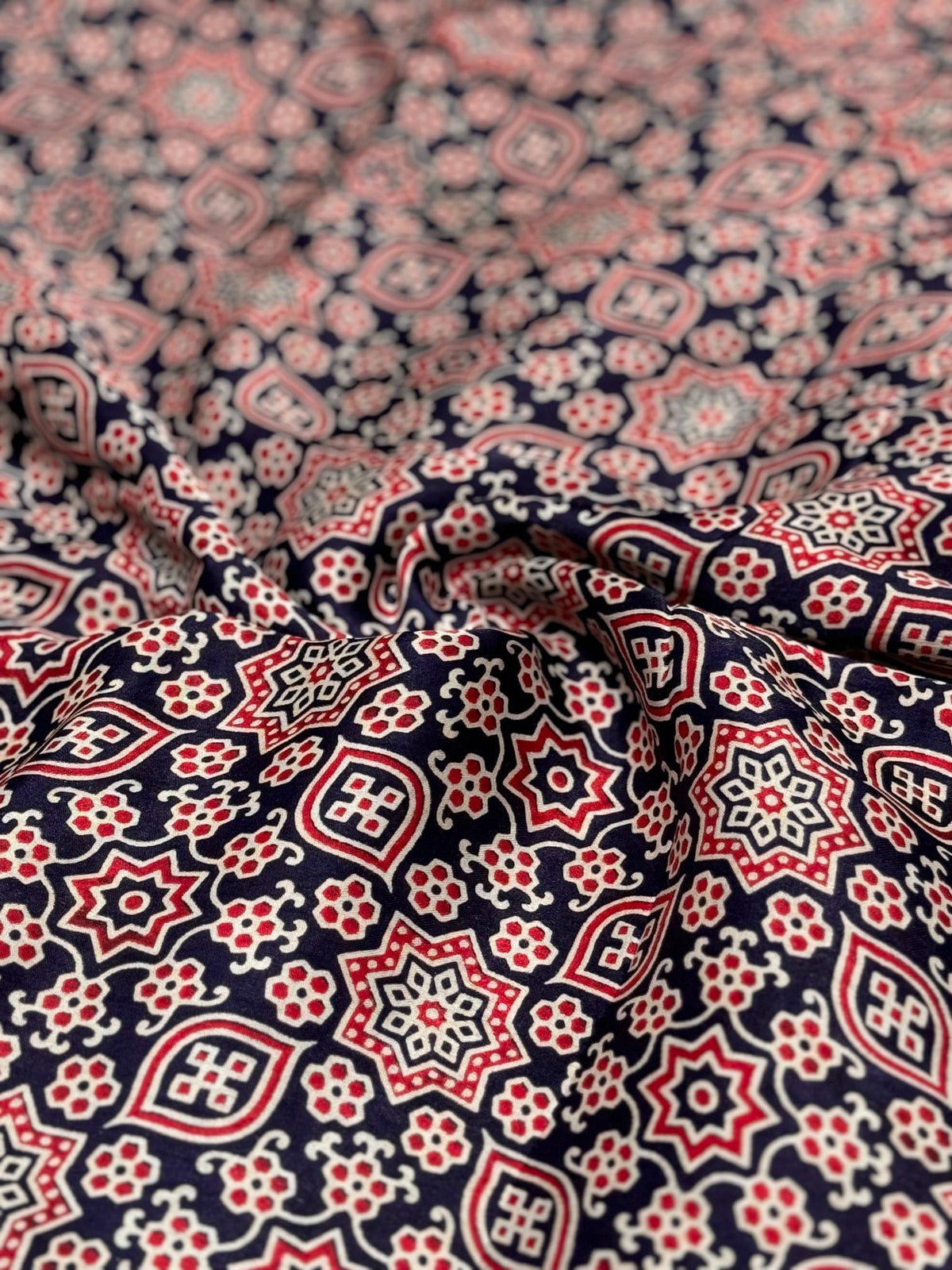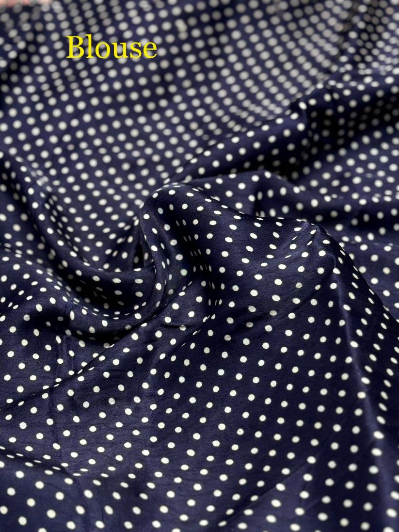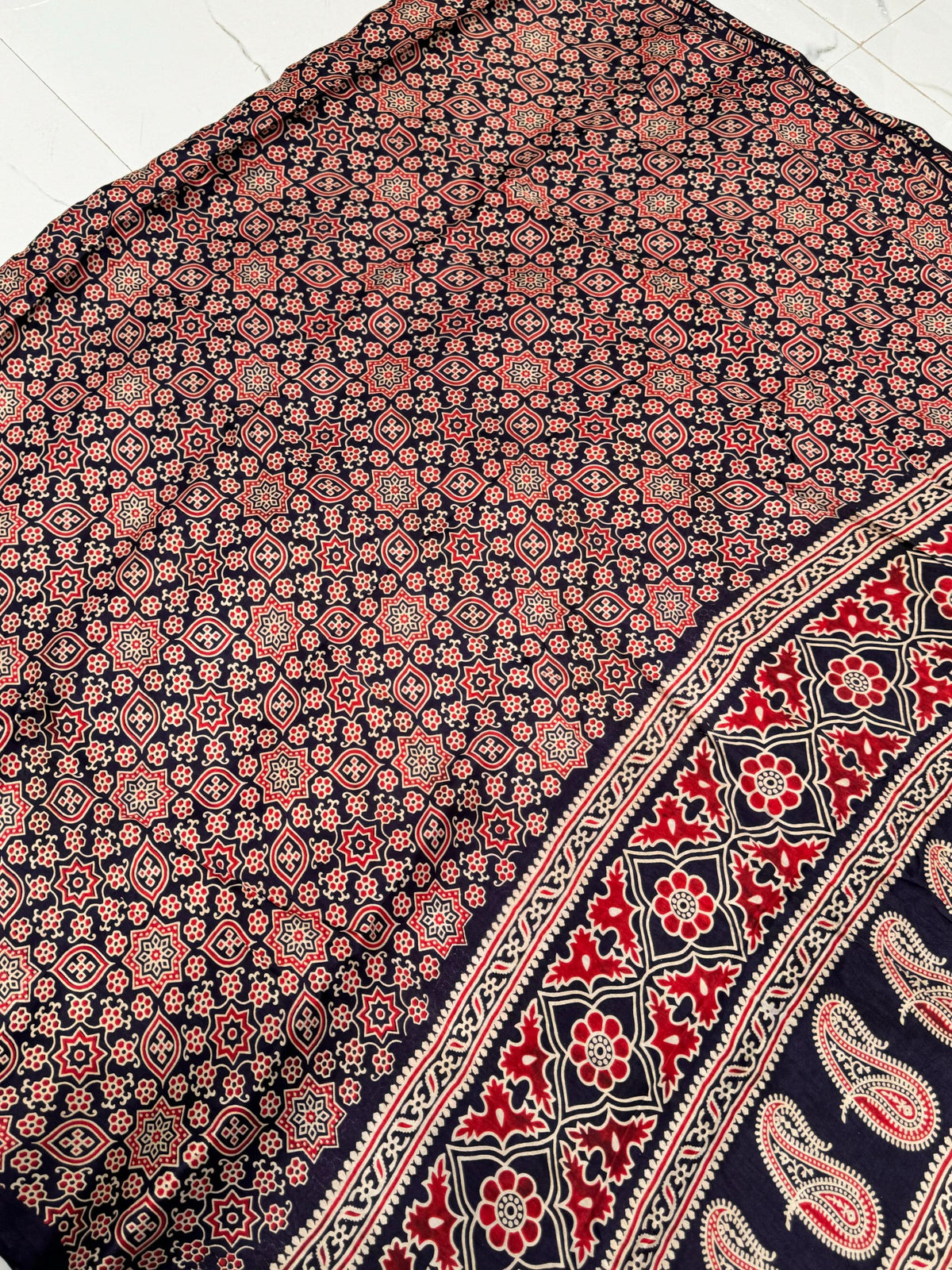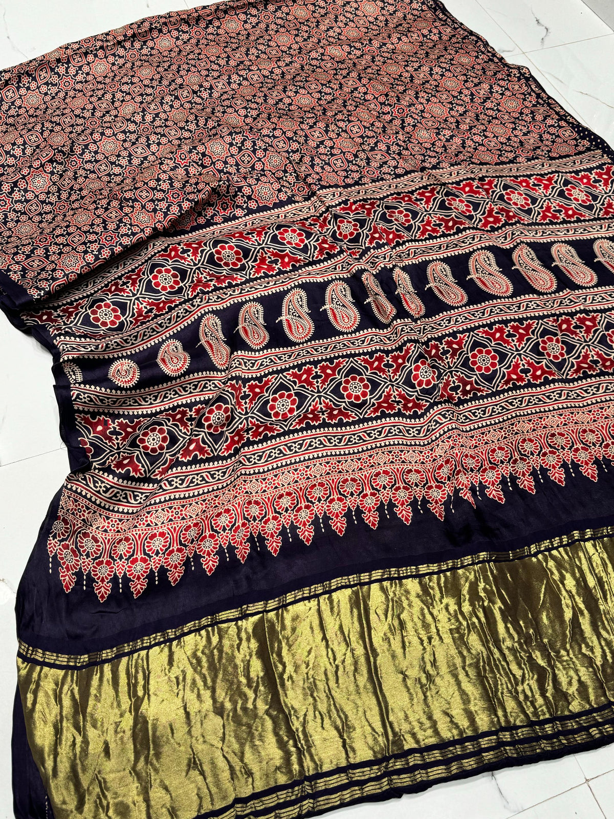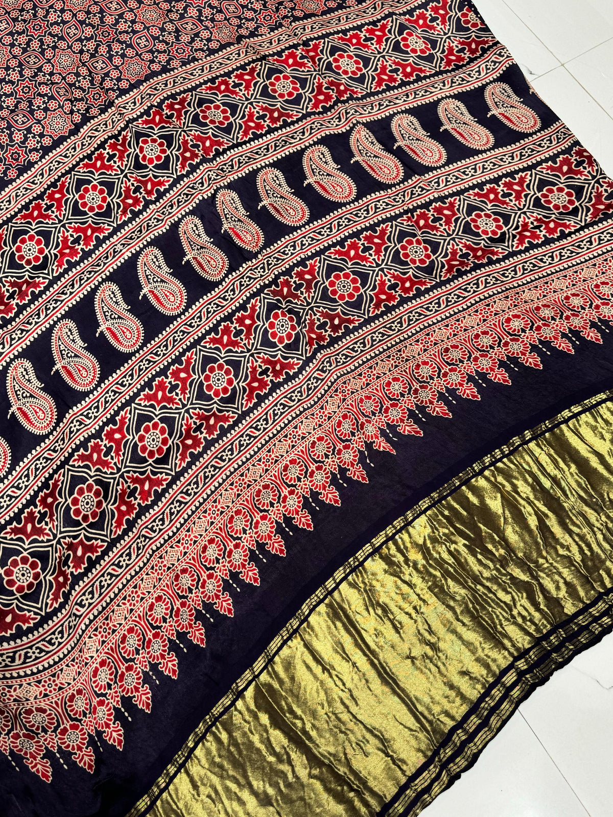 Navy Blue Ajrakh Hand Block Modal Silk Saree With Zari Pallu A1 – Serene Wear index