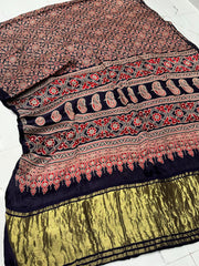 Navy Blue Ajrakh Hand Block Modal Silk Saree With Zari Pallu A1