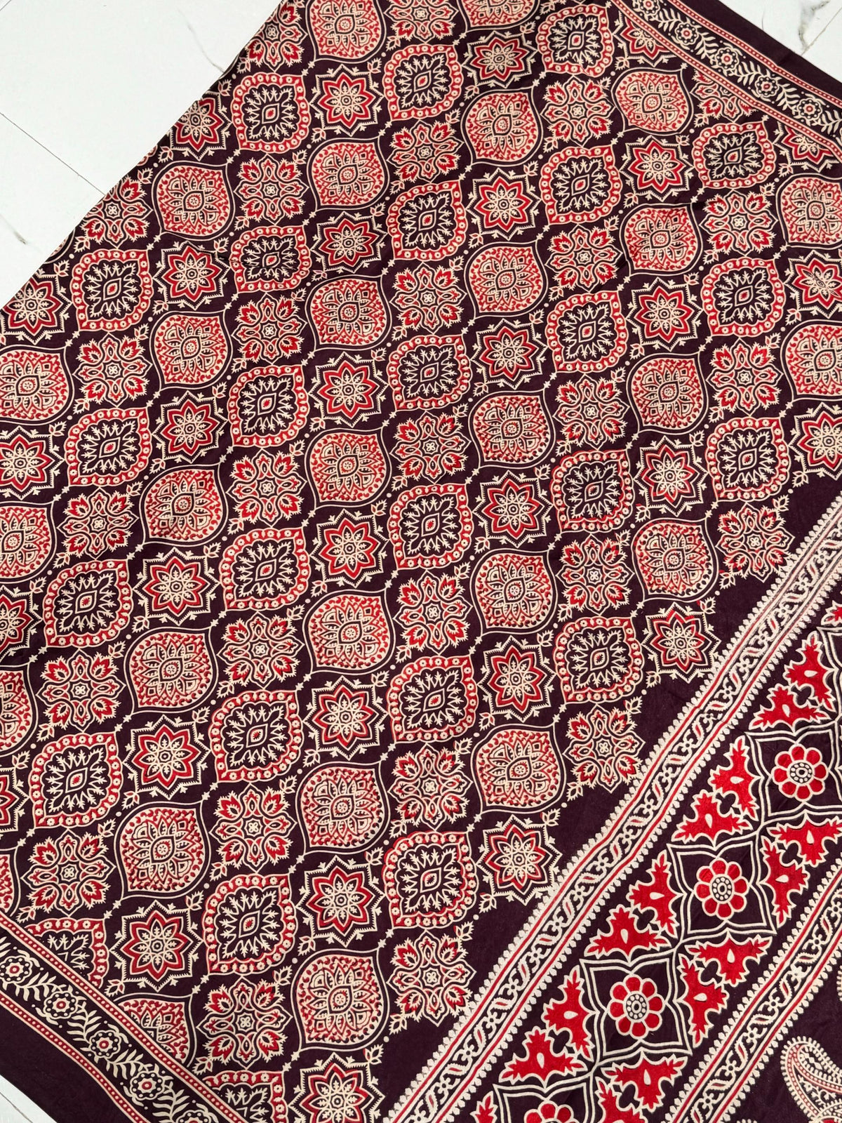 New Wine Ajrakh Hand Block Modal Silk Saree With Zari Pallu A2