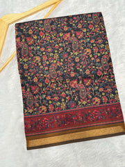 Black Ajrakh With Kalamkari Design Hand Block Print Maslin silk Saree K11