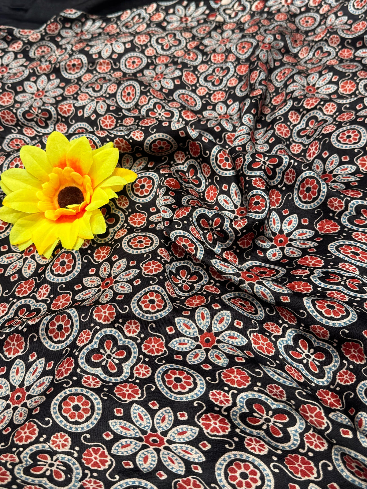 Black And Cream Ajrakh With Kalmkari Pallu Saree